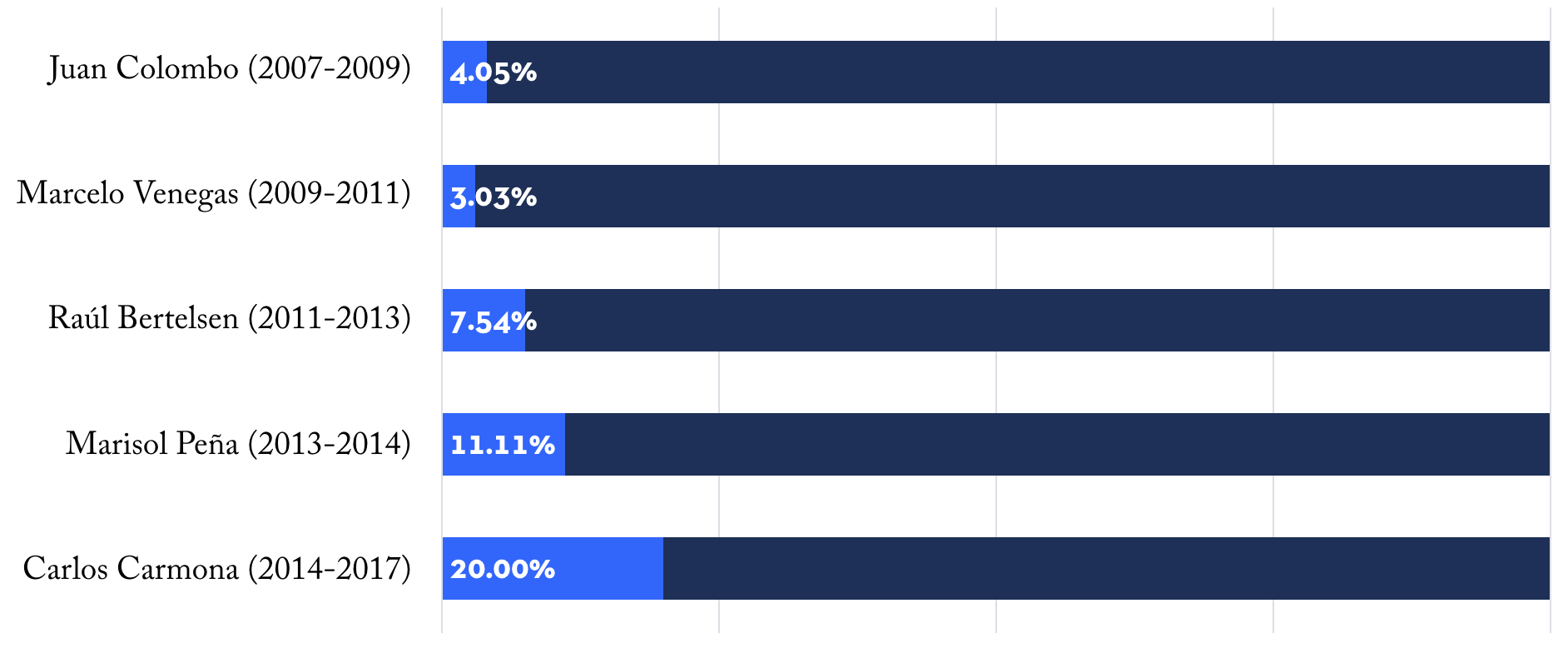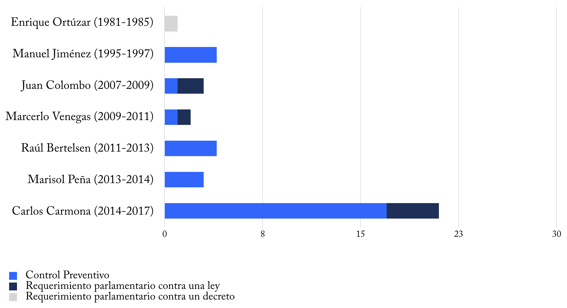 Ahora bien, lo anterior debe ser contrastado con el número de sentencias dictadas durante los respectivos períodos de presidencia. Al respecto, sólo se consideraron las sentencias dictadas por el pleno en materias que, de acuerdo con la ley orgánica del Tribunal Constitucional, pueden ser decididas por medio del voto dirimente. En otras palabras, se excluyeron del cálculo aquellas sentencias acordadas en sala y las relativas a los recursos de inaplicabilidad e inconstitucionalidad. Por último, cabe agregar que tampoco se consideraron las sentencias dictadas durante las presidencias de Enrique Ortúzar y Juan Jiménez porque, siendo previas a la reforma de 2005, operaron en un tribunal que se comportaba siguiendo una lógica distinta, entre otras cosas, porque su composición era impar.