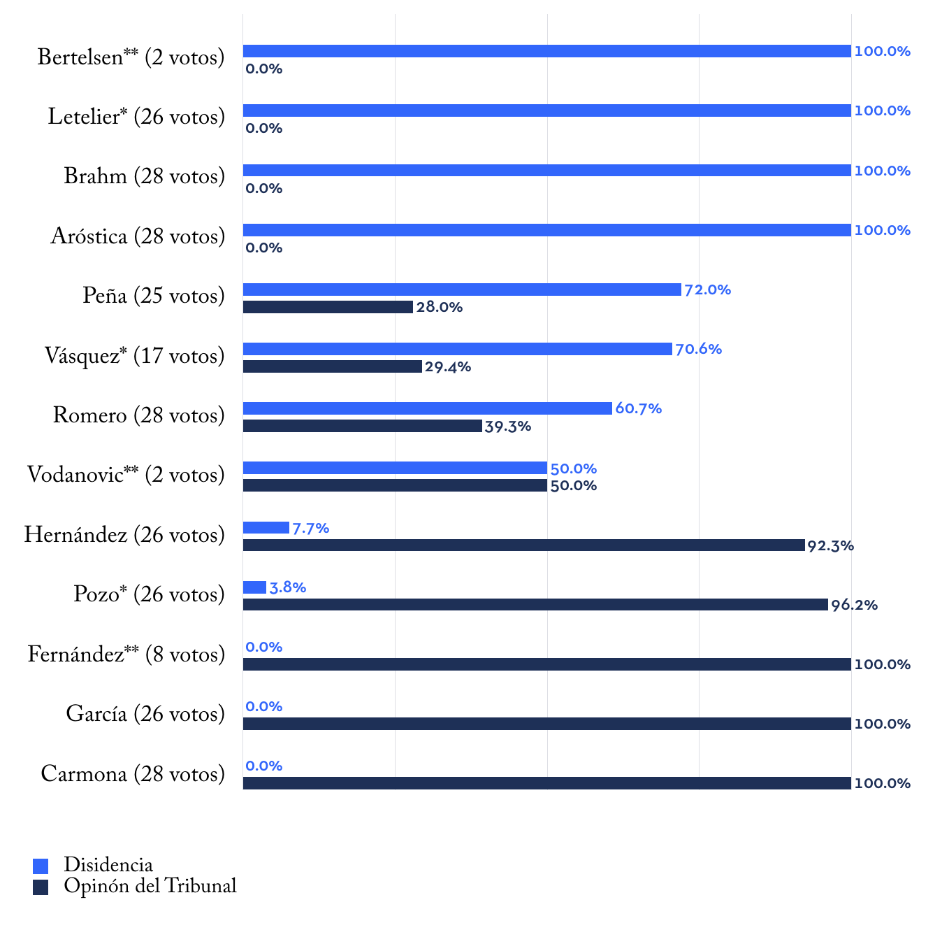 Al respecto, cabe hacer dos prevenciones. La primera es que el gráfico muestra los votos de los miembros del Tribunal Constitucional en dos períodos: antes y después de 2015. En efecto, ese año se produjo la salida de los ministros Fernández (elegido por la Corte Suprema), Bertelsen y Vodanovic (ambos elegidos por el Senado); y la entrada de los ministros Vásquez (elegido por la Corte Suprema), Letelier y Pozo (ambos elegidos por el Senado). El resto de los ministros (Aróstica, Hernández, García, Romero, Brahm, Peña y Carmona) conservaron sus puestos en ambos períodos. En el gráfico, los dos asteriscos (**) sobre el nombre de un ministro indican que salió de su cargo en 2015. A la inversa, un asterisco (*) sobre el nombre de un ministro indica que ingresó al tribunal en 2015. Finalmente, la ausencia de asteriscos indica que el ministro formó parte del tribunal durante toda la presidencia de Carlos Carmona.