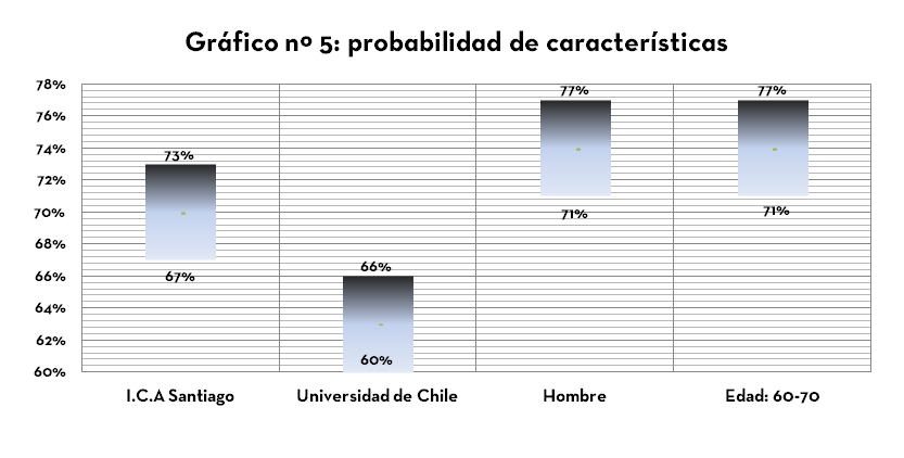 Los cálculos indican que se puede inferir lo siguiente del próximo candidato electo (ver gráfico nº 5): 1) Existe entre un 67% y 73% de probabilidad que provenga de la Corte de Apelaciones de Santiago. 2) Existe entre un 60% y 66% de probabilidades que haya estudiado en la Universidad de Chile. 3) Existe entre un 71% y 77% de probabilidad de que su edad esté entre los 60 u 70 años. 4) Existe entre un 71% y 77% de probabilidad de que sea hombre.