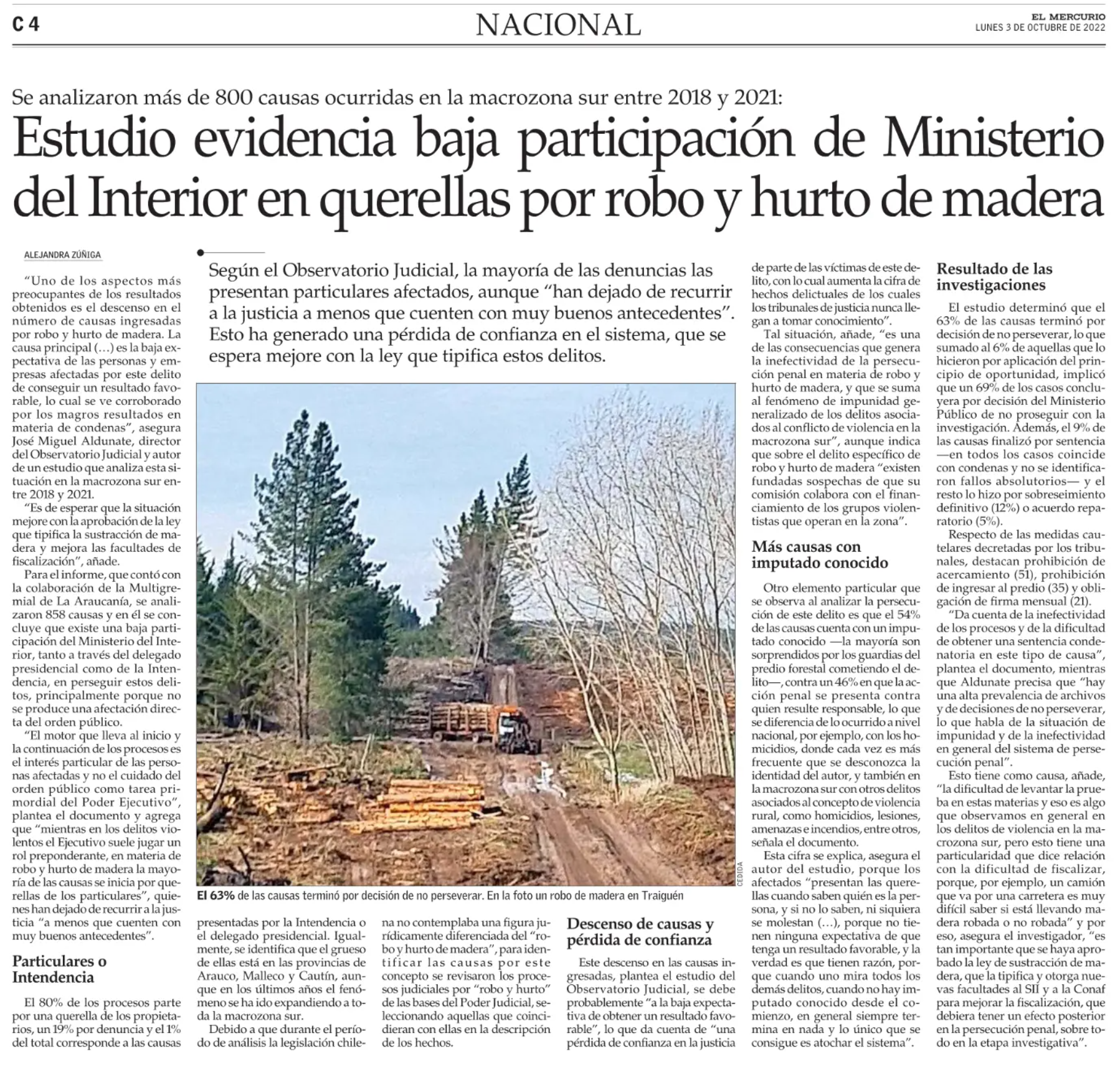 Estudio evidencia baja participación de Ministerio del Interior en querellas por robo y hurto de madera – El Mercurio – El Mercurio – 3.10.2022