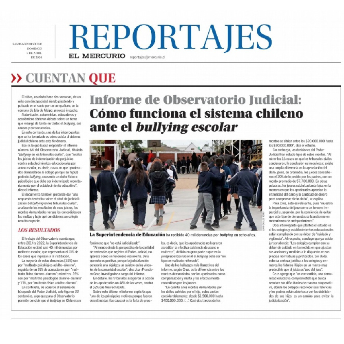 El documento también pretende dar ‘una respuesta tentativa sobre el nivel de judicialización del bullying en los tribunales civiles’, analizando los resultados de esos juicios, los montos demandados versus los concedidos en las multas y bajo qué condiciones un colegio resulta culpable.